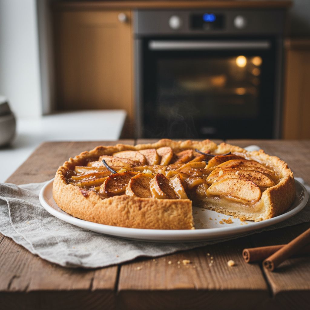 La base reste végétarienne, et se prête à plusieurs variations. Remplace le beurre par une margarine végétale de qualité et choisis une pâte sans beurre pour une version totalement végétale. Tu peux marier la pomme avec la poire ou quelques dés d’abricot sec pour un accent fruité. Pour le service, la crème fraîche légèrement salée crée un bel écho au caramel. J’aime aussi une boule de glace vanille ou cannelle, ou un yaourt grec pour un contraste plus léger. Et si tu cherches une alternative pour un autre jour, la Tarte aux pommes caramélisées cohabite très bien dans un menu où l’on sert un crumble ou une tarte fine; la tarte Tatin reste l’idée parfaite quand tu veux un résultat plus confit, avec un retourné spectaculaire à la sortie du four.