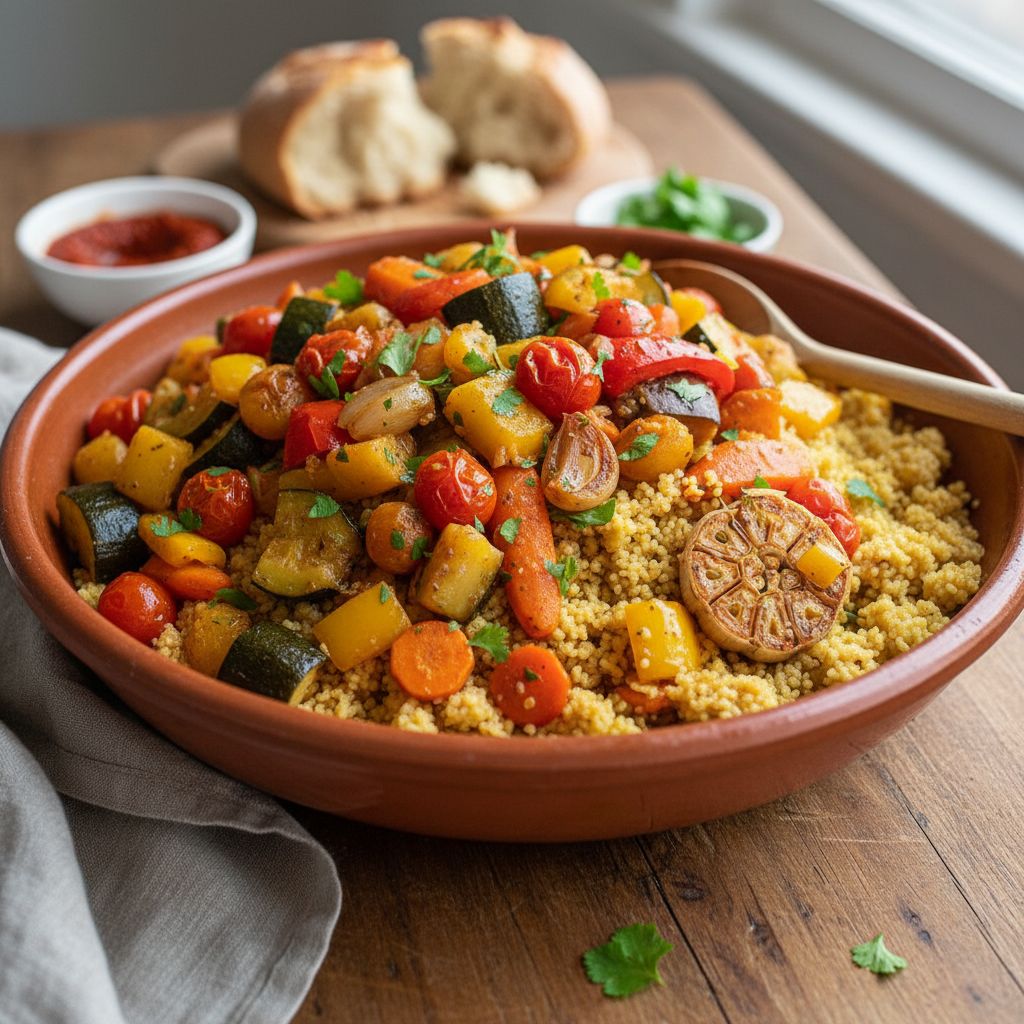 Ce couscous de légumes savoureux transforme les légumes de saison en un plat réconfortant et nutritif. Cette recette végétarienne marie parfaitement la semoule de blé avec des légumes colorés mijotés dans un bouillon parfumé. Simple à préparer, ce plat complet satisfera toute la famille avec ses saveurs méditerranéennes authentiques.