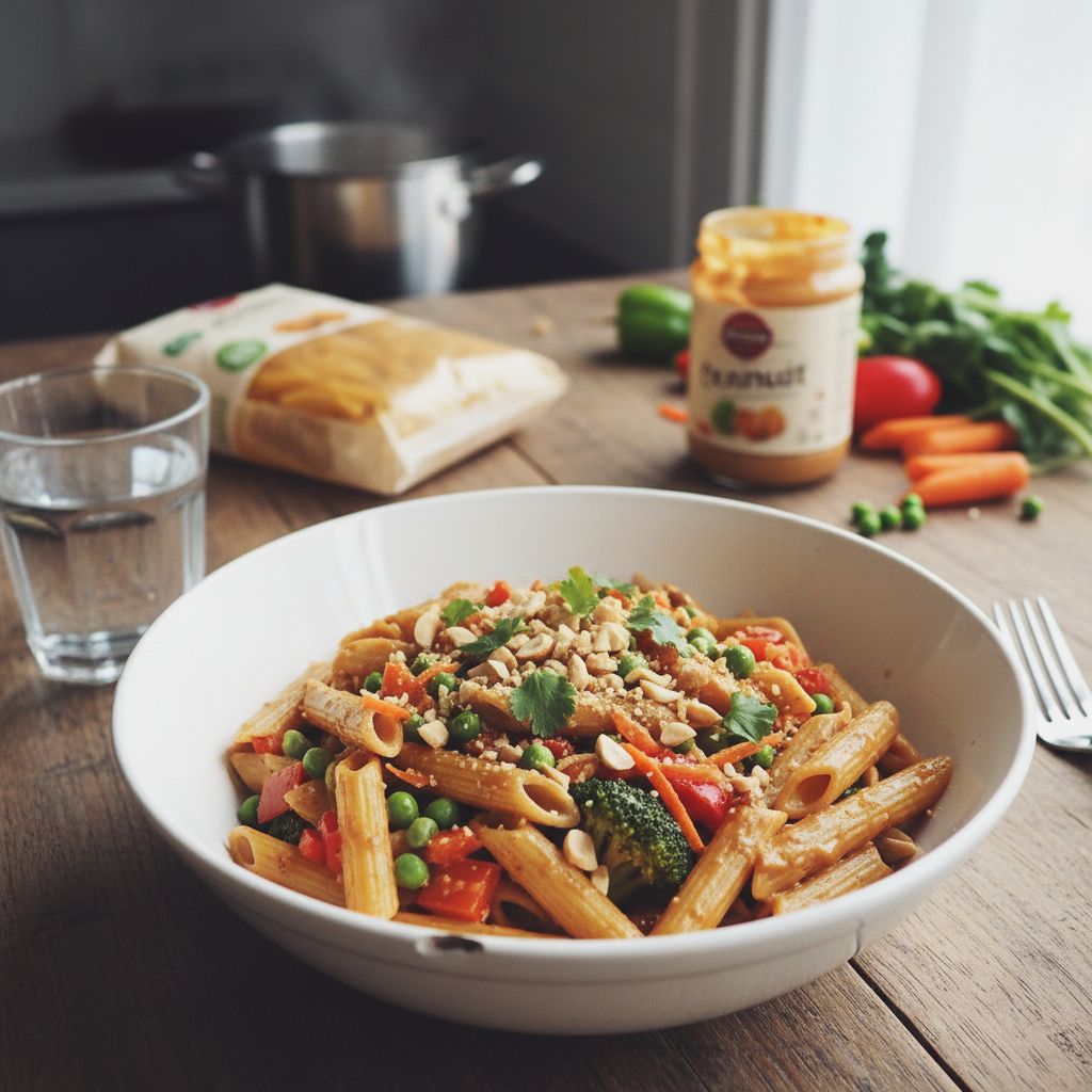 Tu cherches une recette gourmande qui change de l’ordinaire ? Ces penne aux petits légumes et beurre de cacahuète vont te surprendre ! L’alliance du croquant des légumes avec l’onctuosité du beurre de cacahuète crée une harmonie parfaite. Un plat parfumé qui réconforte et qui se prépare en un clin d’œil.