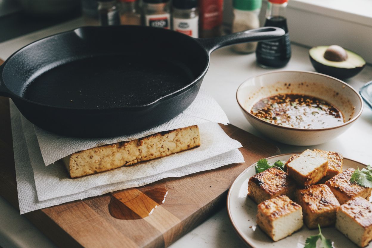 N’oublie jamais cette étape ! Un tofu mal égoutté reste spongieux et n’absorbe pas les saveurs. Tu peux même le presser la veille au réfrigérateur pour un résultat optimal. Plus ton tofu est ferme, plus il sera croquant après cuisson.